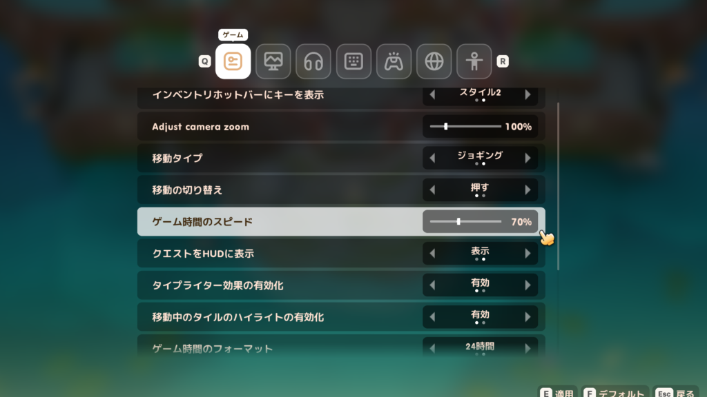 スタミナはあるのに時間が足りないときは設定で時間の流れを遅くできます
