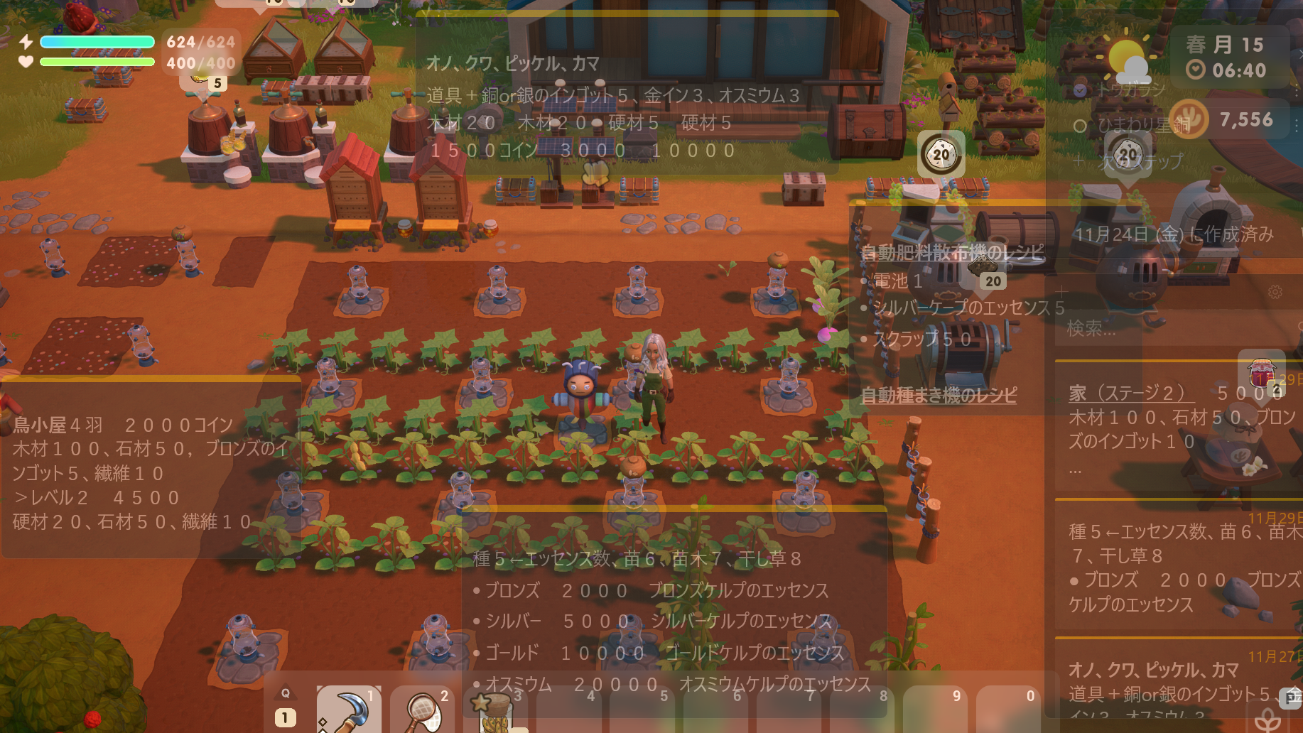 鳥や動物は温度調節器自動エサやり器自動なで器自動収穫器を使えば機嫌が損なわれず、干し草の品質を上げておけば高レアリティのものがもらえます。種なども品質を上げていれば肥料を蒔かなくても品質は保たれ、スプリンクラーに自動収穫器のアタッチメントを付ければ種を蒔くだけでよくなり、他の作業に集中できます。