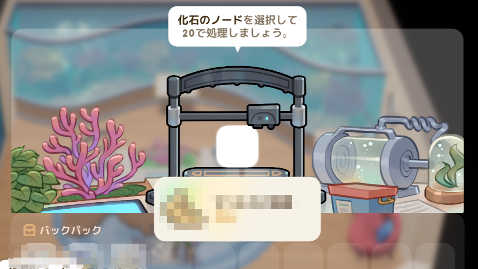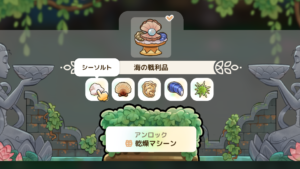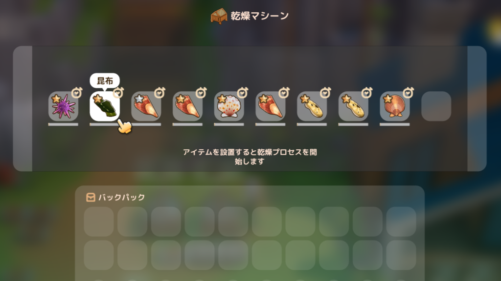 海中掃除中に虫取り網で捕まえた海中生物(貝と昆布)を乾燥マシーンに入れると、次の日には乾燥した何か(回復アイテム)が出来上がっています。