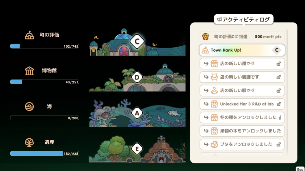 街のレベルによってお店に並ぶ商品が変わります。これは町ランクD→C時点のもの。