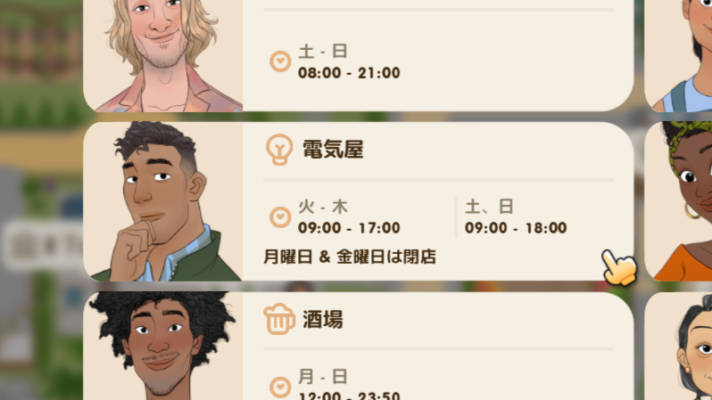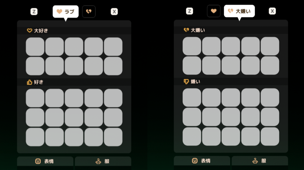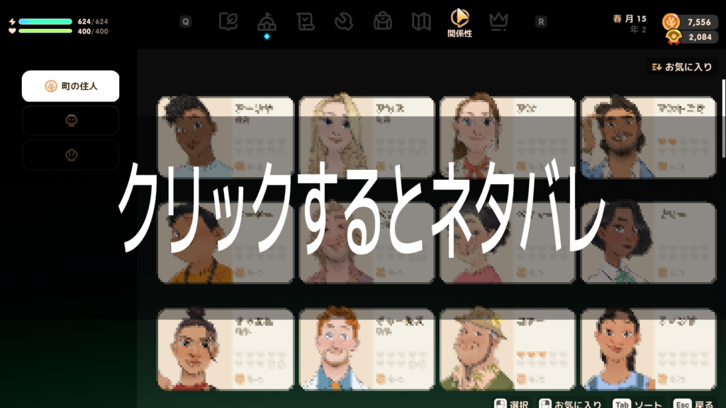 すると関係性のところに人物カードが並ぶようになり、名前と顔、好感度、プレゼントを渡したかどうか確認できるようになります。人物カードをクリックすると大好きなもの10個、好きなもの15個、大嫌いなものも10個、嫌いなものも15個の空欄があります。